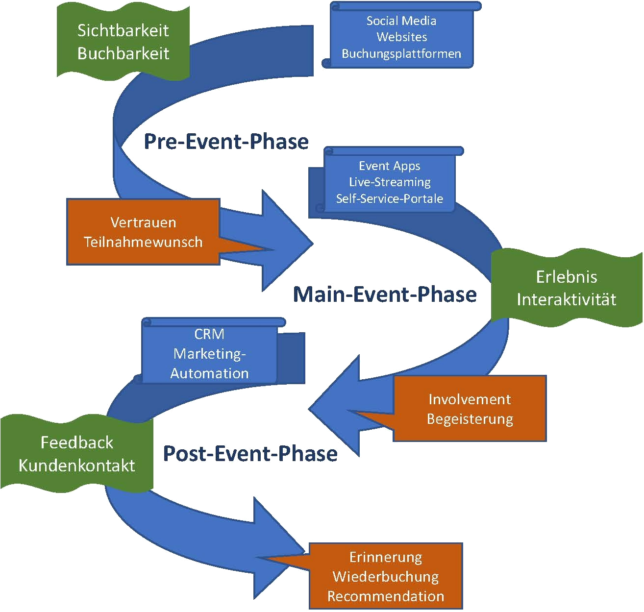 Digitale Touchpoints entlang der Customer Journey im Veranstaltungsbereich – von Sichtbarkeit und Buchbarkeit in der Pre-Event-Phase über Erlebnis und Interaktivität während des Events bis hin zu Feedback und Kundenbindung in der Post-Event-Phase.