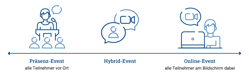 Was sind hybride Events überhaupt? Wer von hybriden Events spricht, meint im Allgemeinen den Mix aus einem Präsenz-Event sowie einem Online-Event. Dabei gibt es große Meinungsunterschiede darüber, wie dieser Mix aussehen kann oder sollte. Für die einen beginnt ein hybrides Event dann, wenn auf einem Präsenz-Event ein Live-Stream aufgenommen und über das Internet verfügbar gemacht wird. Im einfachsten Falle sind dabei lediglich die Referenten und der Veranstalter vor Ort, während sich alle Teilnehmer online zuschalten. Deutlich komplexer und damit auch wesentlich aufwendiger in der Organisation und Finanzierung sind hybride Events, die zum gleichen Zeitpunkt die Teilnahme von Online-Publikum sowie Teilnehmern vor Ort ermöglichen. Die Grenzen zwischen hybriden Events und reinen Präsenz-Events beziehungsweise reinen Online-Events sind fließend: