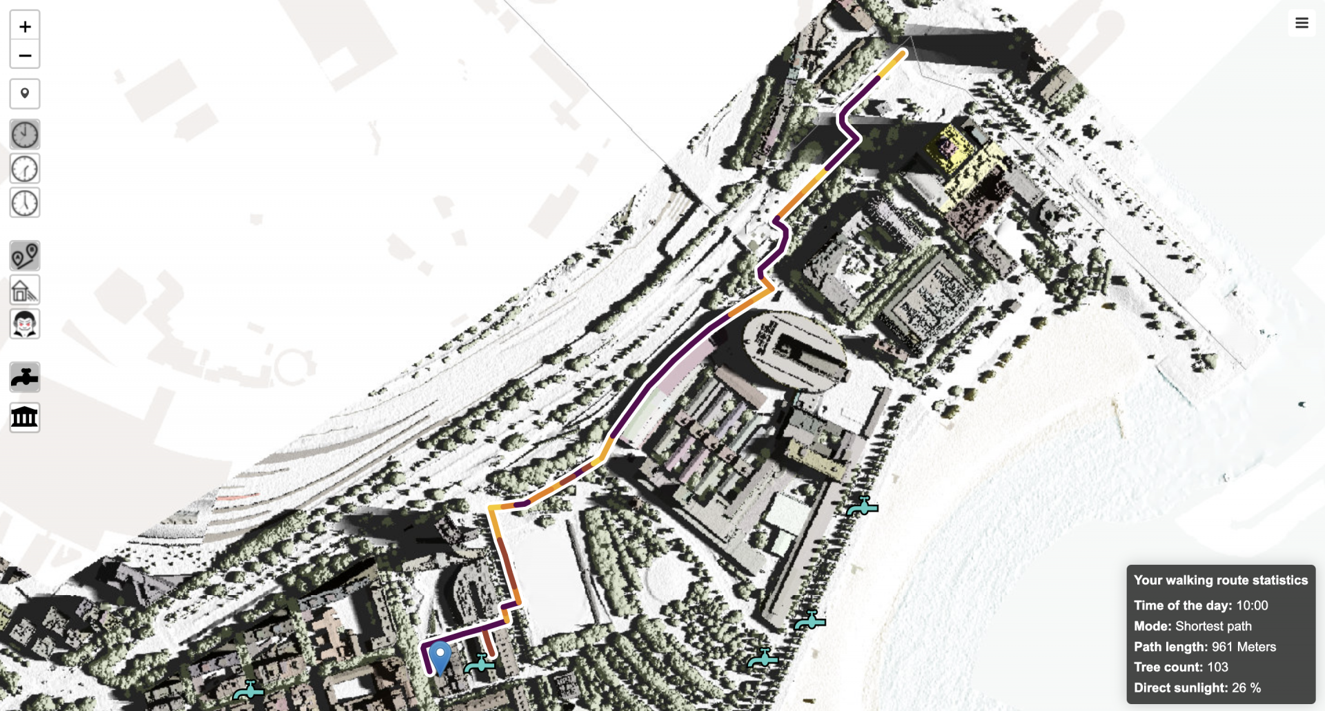 Im Schatten durch Barcelona: In Barcelona können Gehwege gemäß der Tageszeit so kalkuliert werden, dass sie möglichst lange im Schatten liegen. Zusätzlich lassen sich Trinkbrunnen und Gebäude zum Abkühlen anzeigen. Für die ganze Stadt ist die App allerdings noch nicht verfügbar. Foto: Barcelona Regional