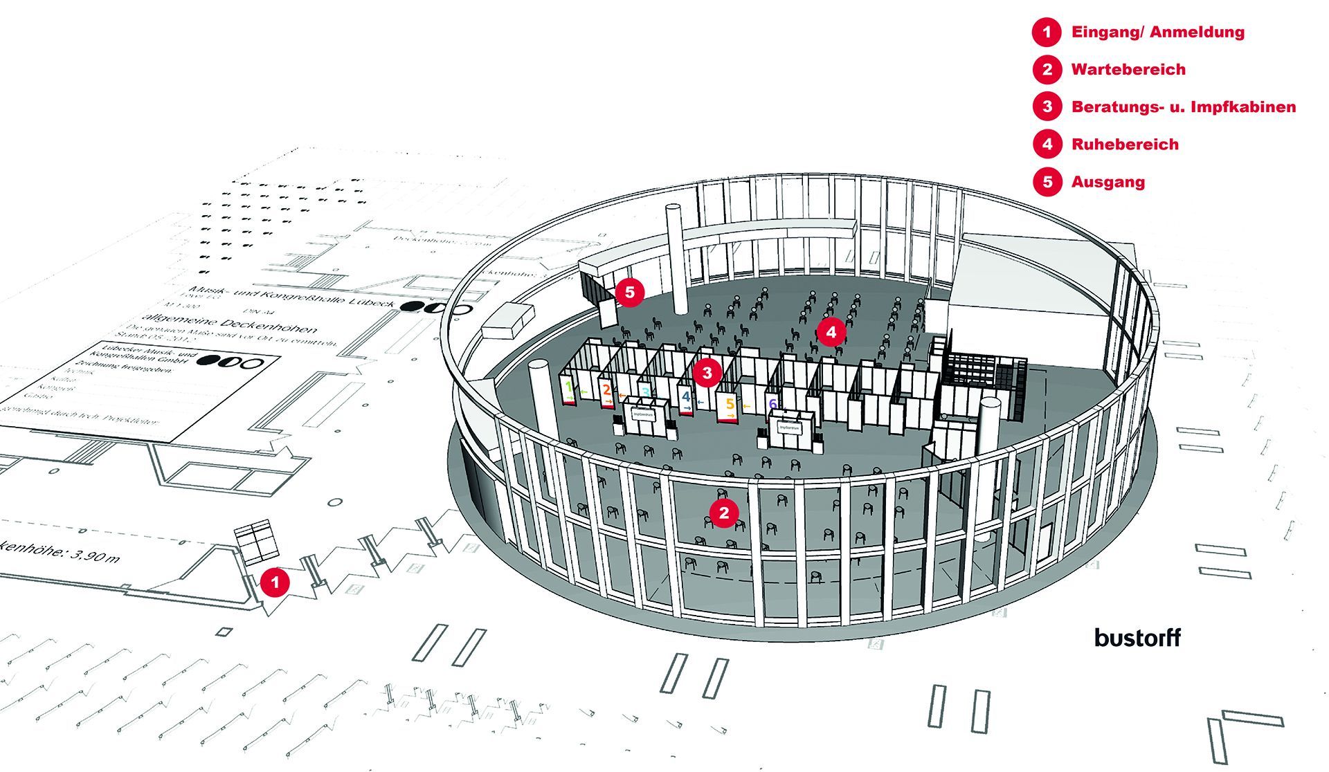 Vier Wochen nach der ersten Anfrage am 12. November 2020 ist das Impfzentrum am 14. Dezember 2020 bereit zur Übergabe an die Hansestadt Lübeck und ihre Betreiberin, die Feuerwehr. Die reine Errichtung des Impfzentrums dauert nur 60 Stunden. Alle erforderlichen Bereiche wie das Back Office, die Anmeldung, die Impfstraßen und Wartebereich sind in einem Raum, der Rotunde, integriert und die Wege kurz. In den Kabinen können parallel Beratungsgespräche und Impfungen durchgeführt werden und bis zu 1.000 Personen täglich gegen das Coronavirus geimpft werden. Der Impfvorgang von der Anmeldung bis Nachruhen beträgt ungefähr 20 Minuten, davon sind 15 Minuten Ruhezeit.