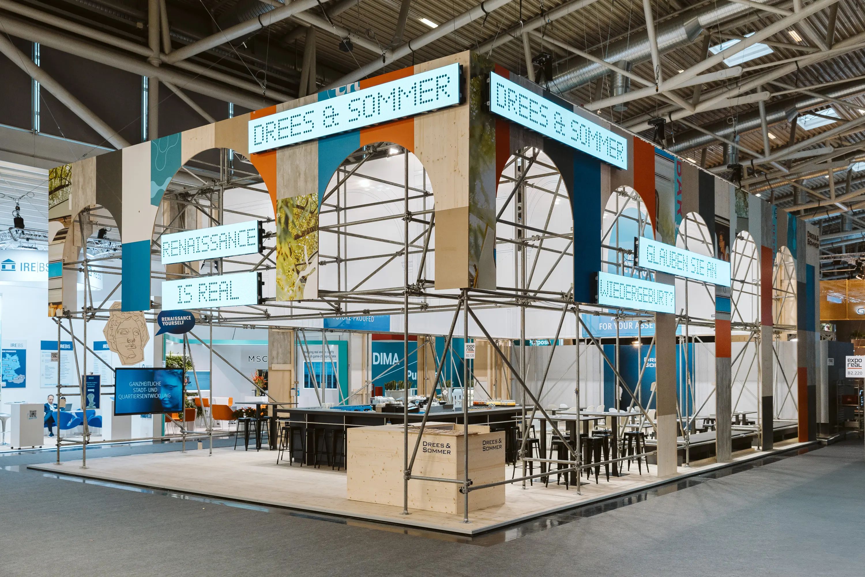 Ausgezeichnetes Kreislaufdesign: Der Messestand „Real Renaissance“ (Expo Real 2024) wurde mit dem German Design Award 2026 in der Kategorie „Excellent Architecture – Circular Design“ prämiert und steht exemplarisch für modulare, wiederverwendbare Standkonzepte im Sinne nachhaltiger Eventgestaltung. Foto: Drees & Sommer SE