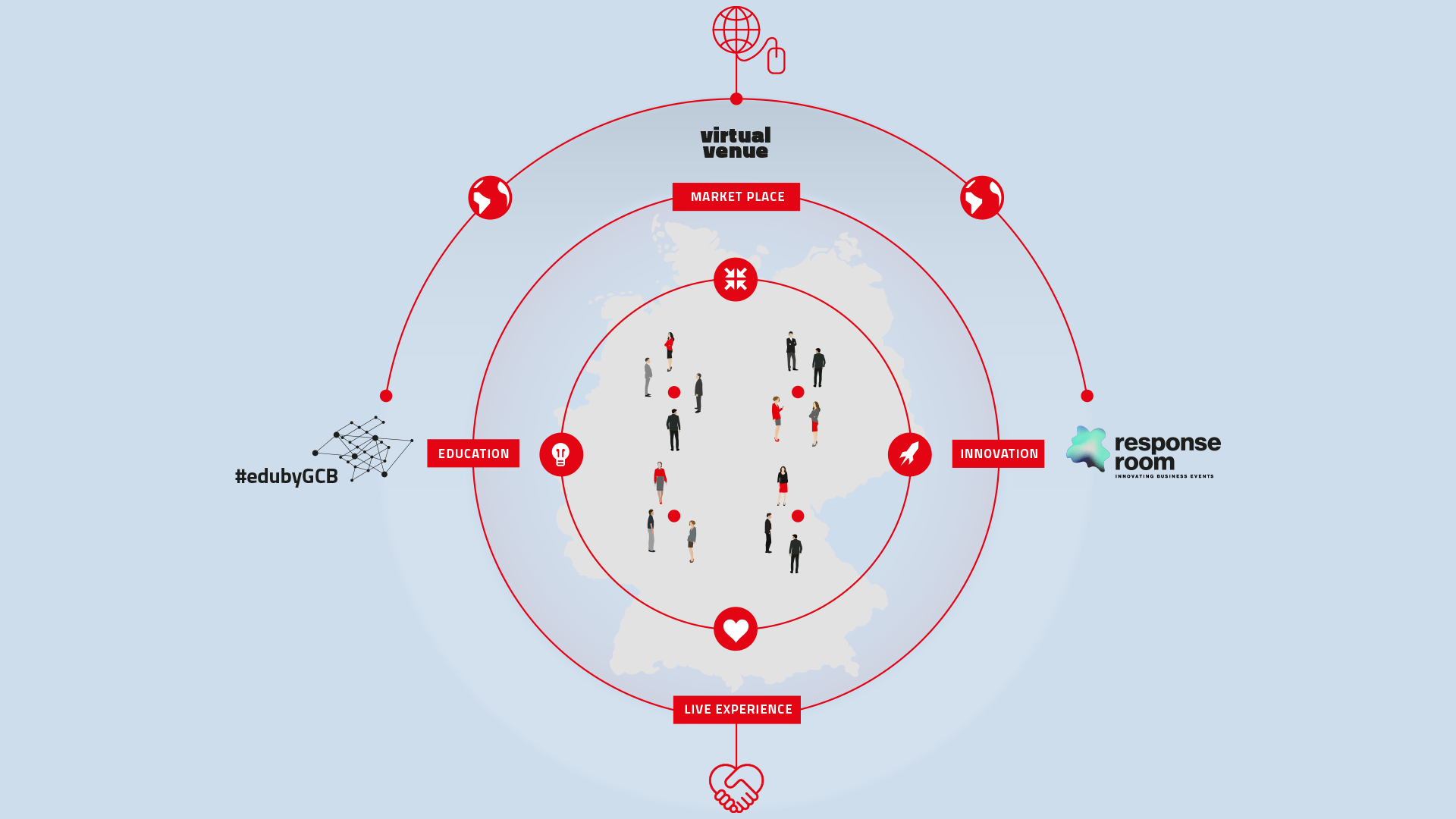 Die Sommer-Kampagne „Germany – at the heart of future events”: die vier Elemente Virtual Marketplace, Live Experience, Education und Innovation greifen ineinander. Foto: GCB