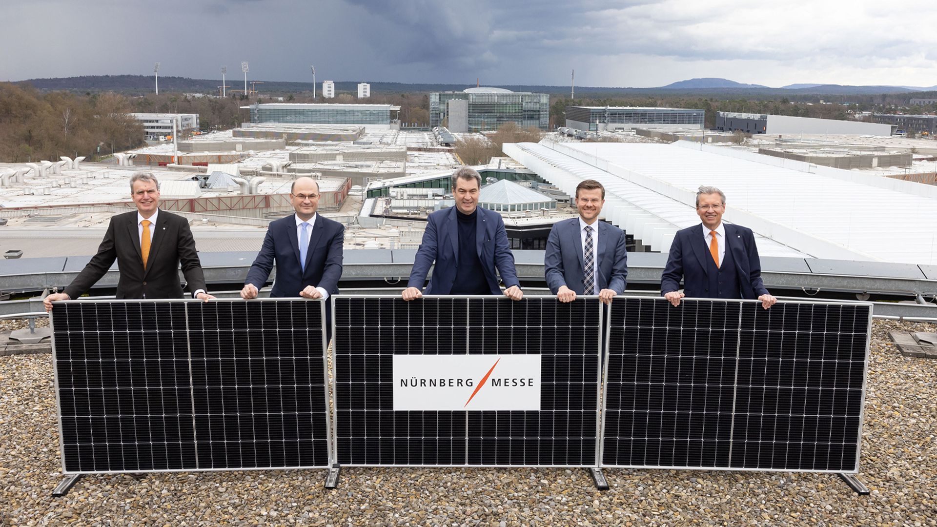 Baubeginn und Modullegung für das NürnbergMesse Hybridkraftwerk am 24. März 2023. V.l.n.r.: Peter Ottmann, Geschäftsführer der NürnbergMesse, Albert Füracker, Bayerischer Staatsminister für Finanzen und Heimat, Dr. Markus Söder, Bayerischer Ministerpräsident, Marcus König, Nürnbergs Oberbürgermeister, und Prof. Dr. Roland Fleck, Geschäftsführer der NürnbergMesse. Foto: NürnbergMesse, Ralf Roedel