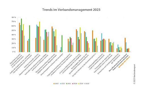 Top-10-Trends im Jahresvergleich 2018–2023: Wie 2021 kommt die Digitalisierung auf Platz 1, genauer: die Digitalisierung für den Verband weiter voranzutreiben. Quelle: Verbändereport