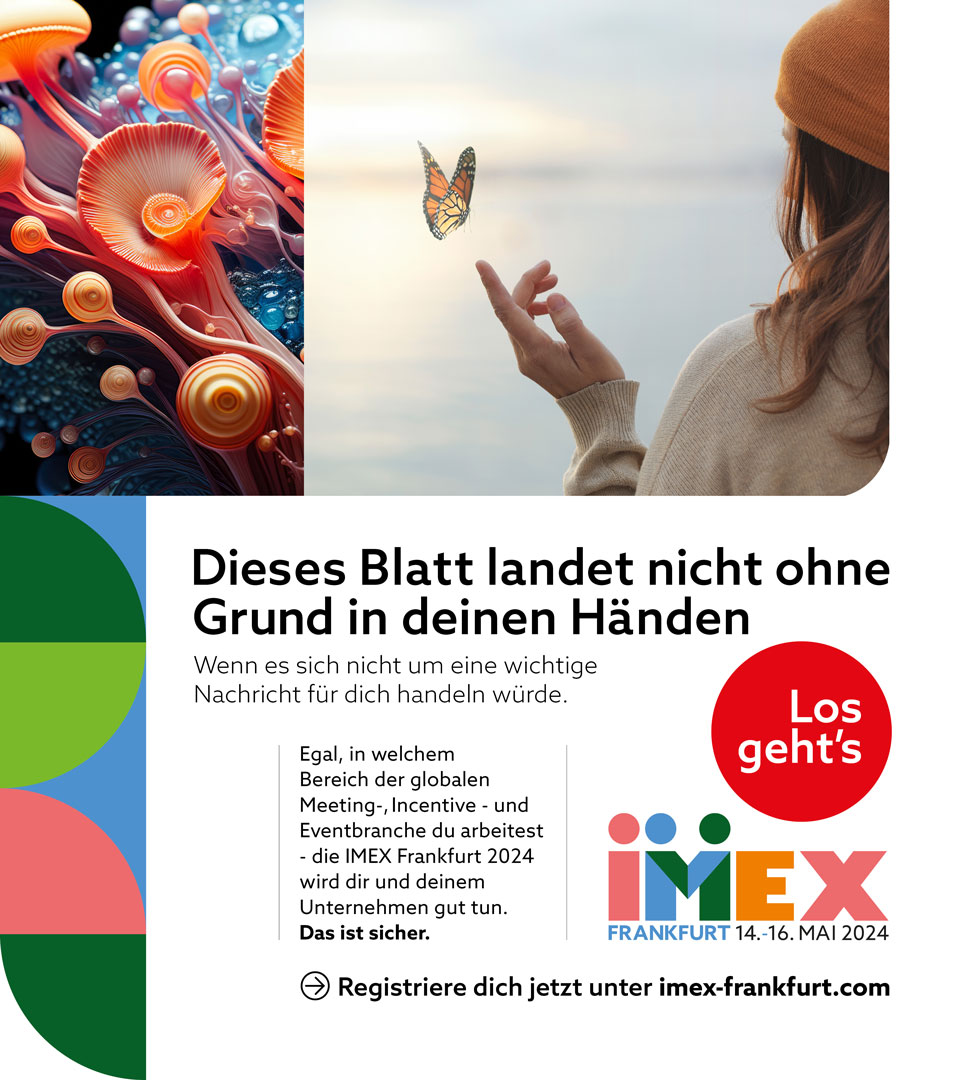 "By choosing impact as our Talking Point for 2024, we're sending out a timely and important call to our global industry, and we're excited to see how our community will choose to contribute," explains Carina Bauer on the guiding theme for the next two years. The CEO of the IMEX Group adds: "Intention is one thing, but action is everything – it's time to make a bigger, more positive impact." She emphasizes the "act" in "impact". For the trade fair organizer, this is tantamount to a call to the event industry to tackle the major problems facing our planet and our society. To this end, IMEX wants to invite those responsible for events to make an impact through their personal and professional actions.