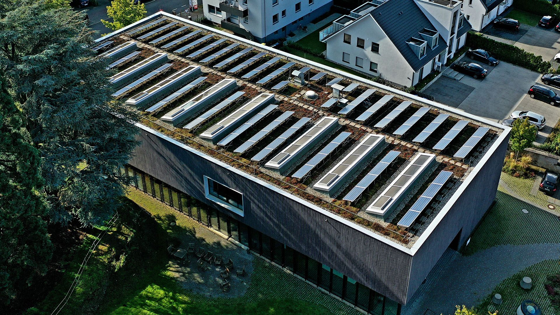 Auf dem Ausstellungsgebäude der Deutschen Bundesstiftung Umwelt ist ein Gründach mit Photovoltaik kombiniert. Das Gründach hilft beim Schutz der Biodiversität und die Photovoltaik erzeugt jährlich mehr Energie, als das Plusenergiehaus für Strom und Wärme benötigt. Foto: DBU