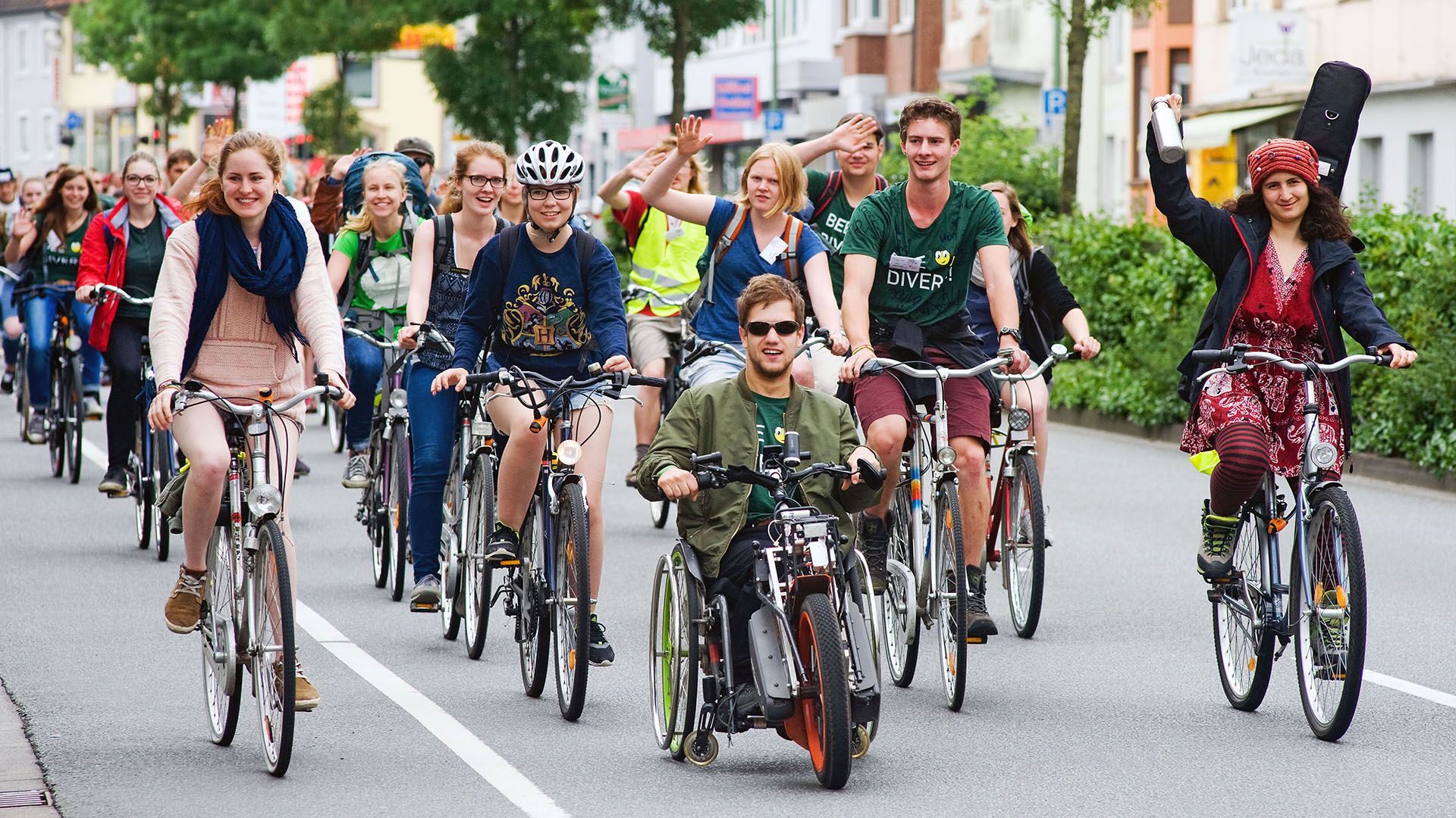 Die rund 150 Teilnehmenden des Jugendkongresses Biodiversität mit dem Fahrrad auf dem Weg von der Unterkunft zum Kongresszentrum. Foto: DBU, Michael Münch