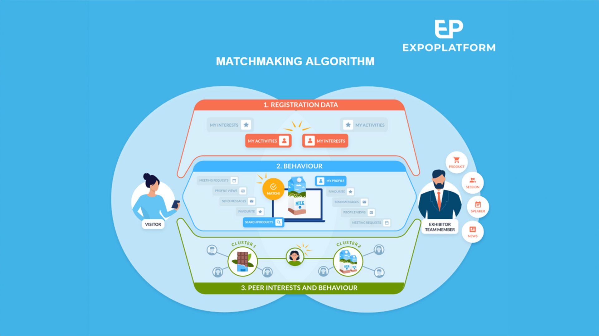 Jens Schindler, Director DACH at ExpoPlatform, describes it like this: "A matchmaking algorithm works on different levels." At the basic level, the algorithm compares users' interests and offers and links them with suitable content such as people, products, news or lectures. At the next level, the algorithm not only analyses terms, but also user behaviour: which content is viewed and which is clicked on? This allows the suggestions to be tailored more specifically to individual preferences. At the highest level, the algorithm recognises patterns in user behaviour and uses this knowledge to comb through the entire database. This enables it to create even more precise and relevant recommendations.
