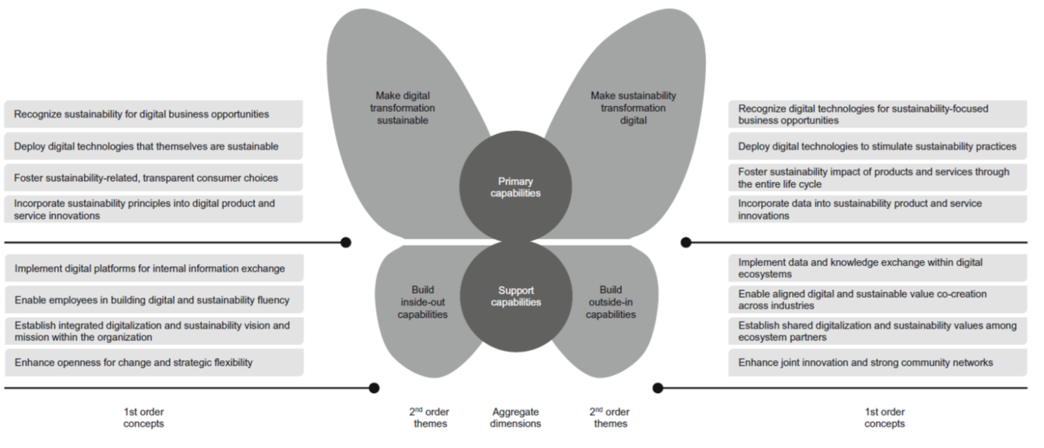 Twin transformation capability framework: The twin transformation process can be compared to the metamorphosis of a larva into a butterfly. The strong body holds the butterfly together so that it relies on all four wings to fly. Similarly, organisations can only "take off" to twin transformation if the relevant dynamic twin transformation capabilities have been developed and implemented in all four capability categories. Graphic: A.-S. Christmann et al: The Twin Transformation Butterfly (2024)