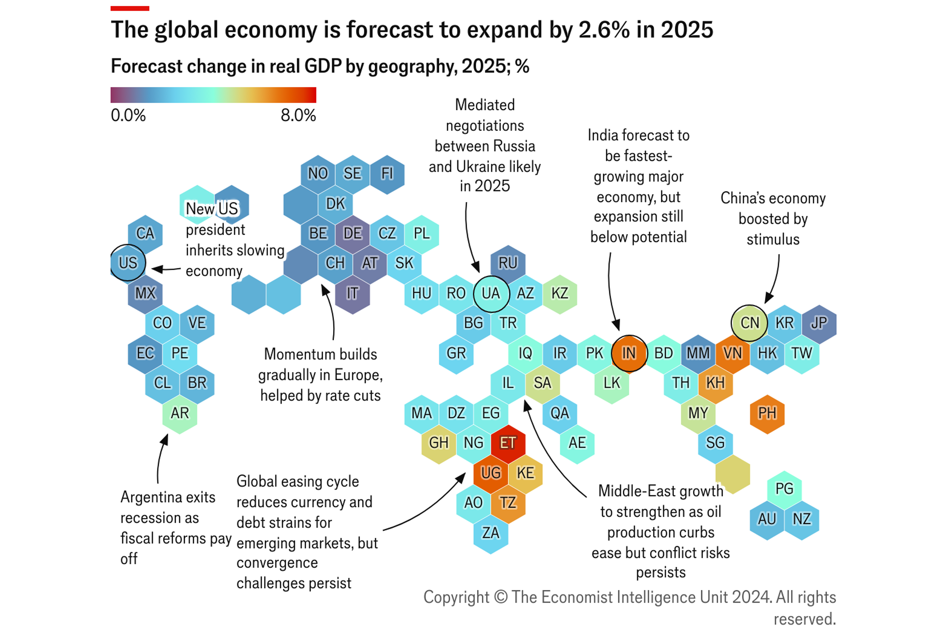 The global economy is expected to grow in 2025 at a similar rate to the previous year. Contrary to the picture, the International Monetary Fund (IMF) is forecasting GDP growth of around 3.3 per cent. In the long term, so-called geopolitical "swing states", i.e. countries that maintain good relations with both the OECD members and the BRICS countries, could benefit. An example of this is India, which is expected to be the fastest growing major economy. Graphic: Economist Intelligence Unit