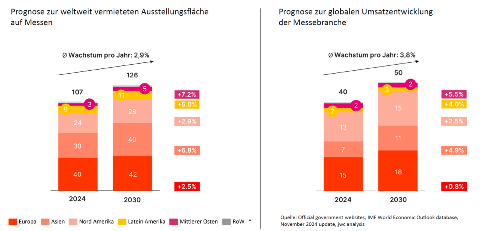 The drivers of the trade fair industry: Forecasts of exhibition space rented at trade fairs worldwide and global sales development in the trade fair industry by region. Graphic: Messe Düsseldorf