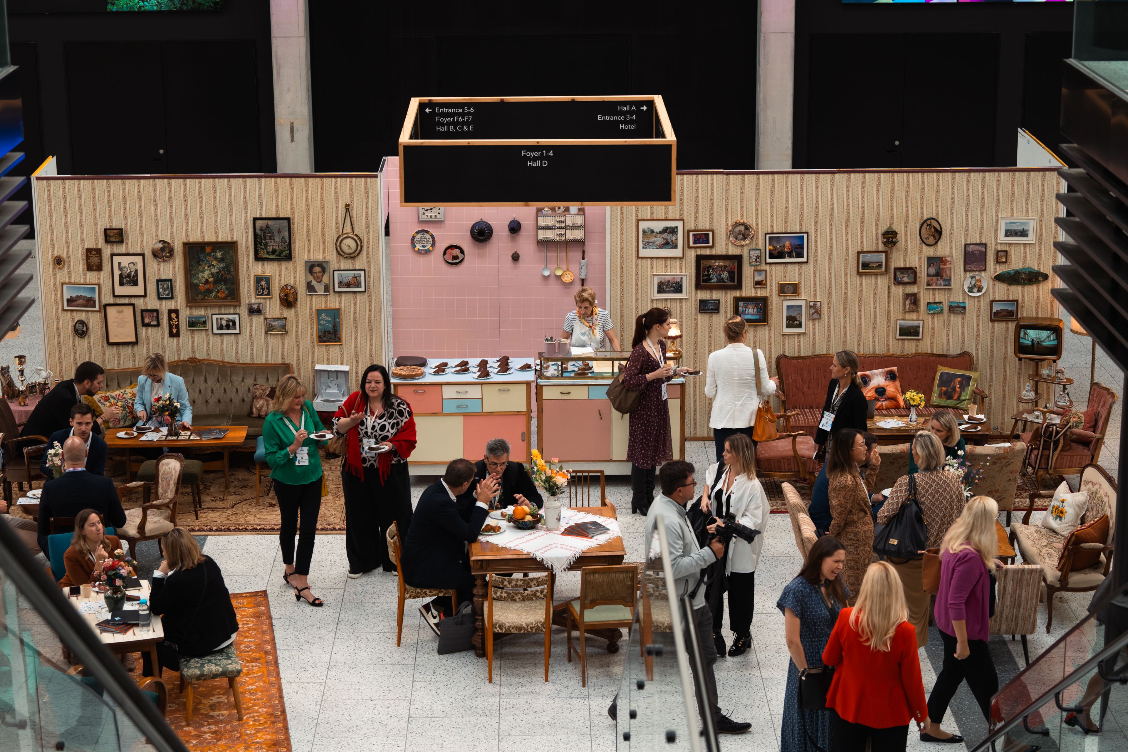 Zeit für mich, mich nach den anderen in der App umzusehen. Es sind 214 Personen angezeigt, aber nicht, ob sie vor Ort sind oder wie ich online. Im Chat ist nichts los. Ich frage in die Runde: Wer ist noch da? In der Zwischenzeit ist die Übung gelaufen und die Teilnehmer gehen in die Pause, um Kaffee zu trinken und in Kontakt zu treten. Nicht einfach so, nein: Sie lernen im Hygge Hub die Kopenhagener kennen und in der Vollpension die Wiener. Die Vollpension hat das Vienna Convention Bureau letztes Jahr eingeführt. Im Wohnzimmer von „Oma“ Doris Horvath gibt es Kuchen gegen Altersarmut und für den Generationendialog, also nachhaltige Initiativen für wirkungsvolle Business Events.