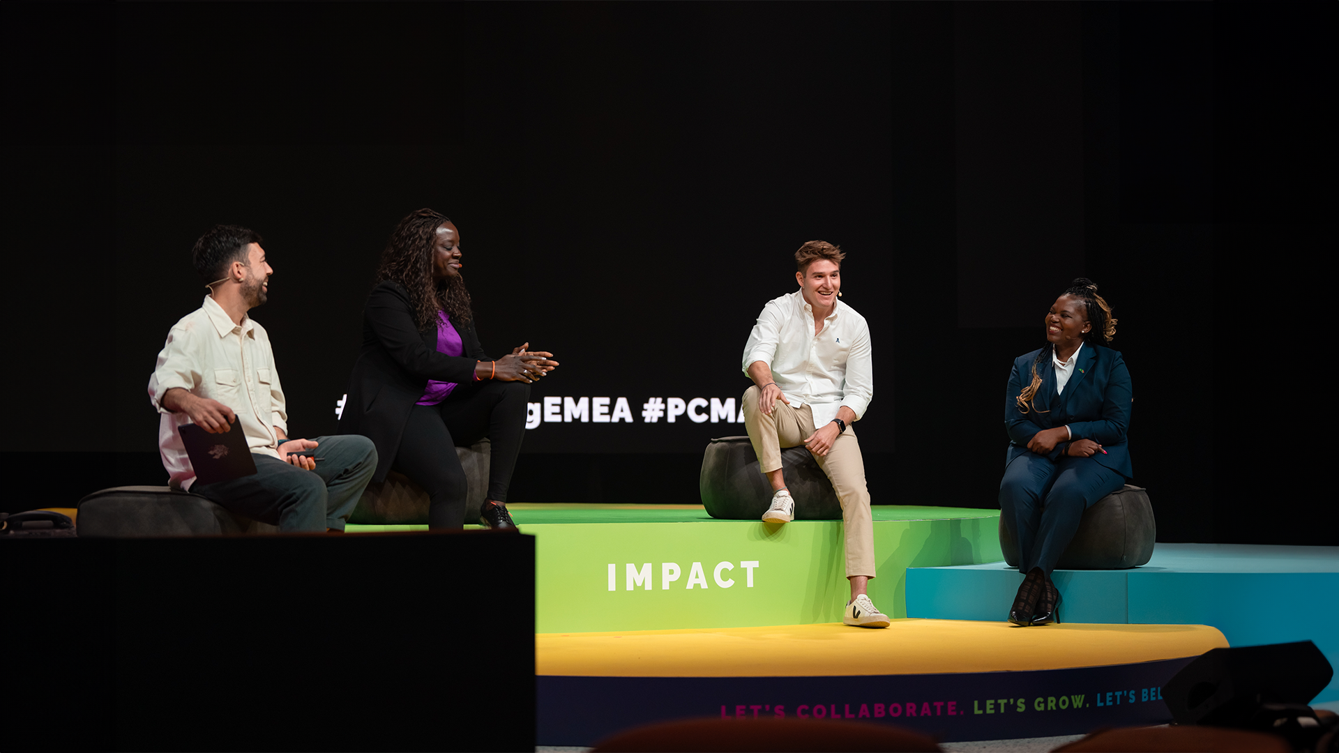 Wie messen wir Wachstum? Darüber sprechen zur Session ”The Great Unspoken – An unfiltered and contrarian conversation about growth, degrowth and disaster” Moderator Felix Rundel, Co-Founder von futurehain, Seynabou Cisse, Global Events Manager bei Dell Technologies, Albert Cerezales Garcia, Strategic Consultant der MCI Group, und Sonto Mayise, General Managerin im Durban KwaZulu-Natal Convention Bureau. Foto: PCMA EMEA
