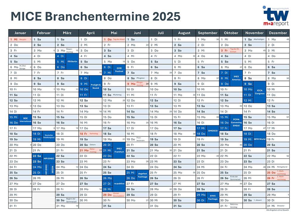 Wie jedes Jahr laden Fachverbände wieder zu Veranstaltungen ein. Das GCB – German Convention Bureau und der EVVC – Europäischer Verband der Veranstaltungs-Centren veranstalten im Februar die Sustainable Events Conference (SECON) auf dem Landgut Stober. Auch die EMEC European Meetings & Events Conference von MPI – Meeting Professionals startet im Februar in Istanbul früh ins Jahr. Der Tag der Industriekommunikation vom Bundesverband für Industriekommunikation (BVIK) findet im Juni in Fürstenfeld statt. Die PCMA Convening EMEA geht Mitte Oktober nach Rotterdam. Der ICCA Congress der International Congress & Convention Association schließt Mitte November das Veranstaltungsjahr in Porto ab.