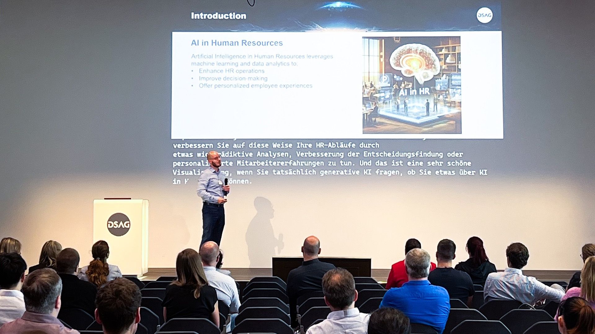 Speech to Text: Anfang Juni 2024 hat die Osnabrückhalle bei den diesjährigen Personaltagen der deutschsprachigen SAP-Anwendergruppe e.V. (DSAG) erstmals künstliche Intelligenz für Echtzeit-Übersetzungen während eines Vortrags eingesetzt. Dabei wurde ein englischsprachiger Vortrag live mit deutschen Untertiteln versehen. Foto: Osnabrückhalle