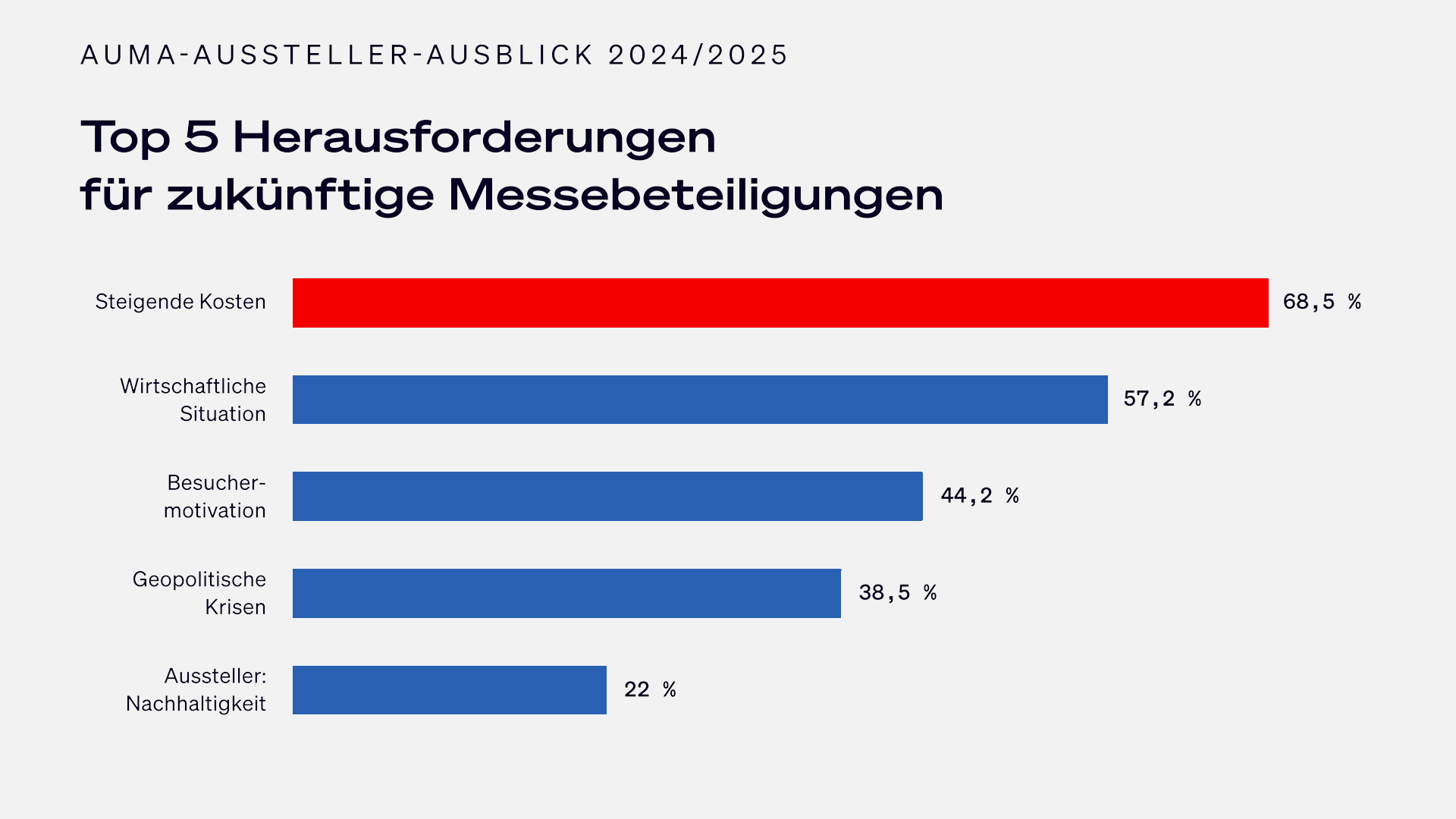 Im AUMA-Veranstalter-Ausblick 2024 – 2025 wie im AUMA-Aussteller-Ausblick 2024 – 2025 stehen Kosten an oberster Stelle der Herausforderungen. Für Aussteller sei der Knackpunkt, dass sie viele Kosten nicht beeinflussen könnten. So etwa Unterkunft, Mobilität und Energie. Denn der Ausblick zeigt noch eine weitere Perspektive: Auch Messebesucher entwickeln ein erhöhtes Kostenbewusstsein. Gleichzeitig wird Besuchern immer wichtiger, etwas auf dem Messebesuch zu erleben. Also eine erneute Herausforderung, bei Kostendruck gestiegenen Anforderungen gerecht zu werden. Das Meeting- und Eventbarometer prognostiziert ebenfalls allgemein einen Anstieg von Budgets um knapp 20 Prozent von 2023 auf 2024. Von 2022 auf 2023 waren es im Schnitt noch knapp 25 Prozent. Inflation und gestiegene Kosten werden von Anbietern und Veranstaltern aus Deutschland, Europa und dem Rest der Welt allgemein als Belastung wahrgenommen. Für Veranstalter aus Deutschland und Europa sind die Kosten scheinbar etwa gleichbedeutend. Für Veranstalter vom Rest der Welt sind die Kosten wesentlich einschlagender.