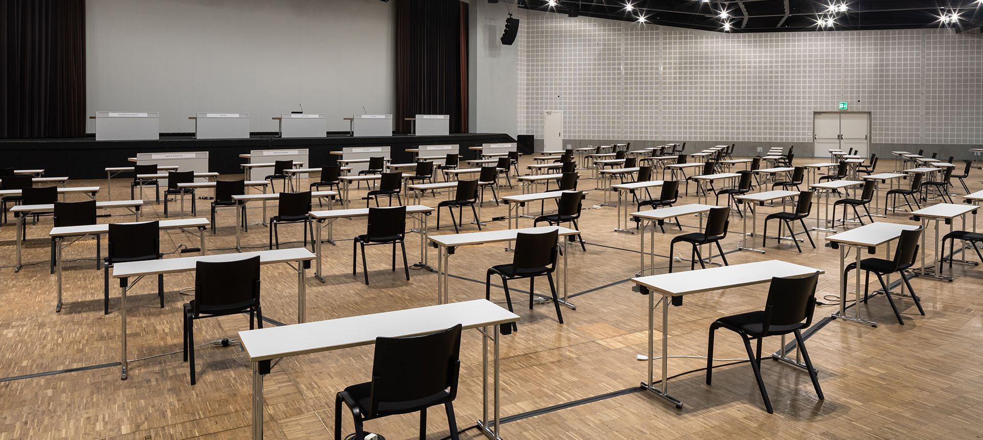 Auch im Estrel Kongresszentrum (ECC) in Berlin sind bereits erste Veranstaltungen unter den neuen Auflagen über die Bühne gegangen, für die neue Abläufe und Konzepte entwickelt wurden. So misst beispielsweise ein Sanitäter am Eingang zur Convention Hall I die Temperatur bei allen ankommenden Gästen. Beim Check-In bekommen Teilnehmer tragbare digitale Abstandsmesser der Firma Kinexon ausgehändigt, die Infektionsketten für Veranstaltungsteilnehmer datenschutzkonform rückverfolgen können. Im Plenum sitzen die Gäste auf Stühlen mit kleinen angefügten Beistelltischen, die gleichzeitig als Abstandshalter und Ablagefläche dienen. Zudem gibt es einen übersichtlichen, Covid-19 konformen Veranstaltungsleitfaden, in dem verschiedene Punkte, wie Raumkonzepte, Hygiene, Ein- und Auslass-Management, Besuchersteuerung oder Catering aufgeführt und erklärt werden. Unter den neuen Bedingungen fand so am 29. Juni die Mitgliederversammlungen des GCB (German Convention Bureau) und EVVC (Europäischer Verband der Veranstaltungs-Centren) erstmals als hybride Veranstaltungen im ECC statt und zeigten: nach langer Pause sind Präsenzveranstaltungen wieder möglich. Das Event war ein Mix aus Live-Event mit bis zu 70 Gästen in verschiedenen Raumvarianten des ECC sowie einem virtuellen Venue von Proske, in dem digitale Inhalte wie Live-Streaming oder Video-Konferenzen eingespielt werden konnten.