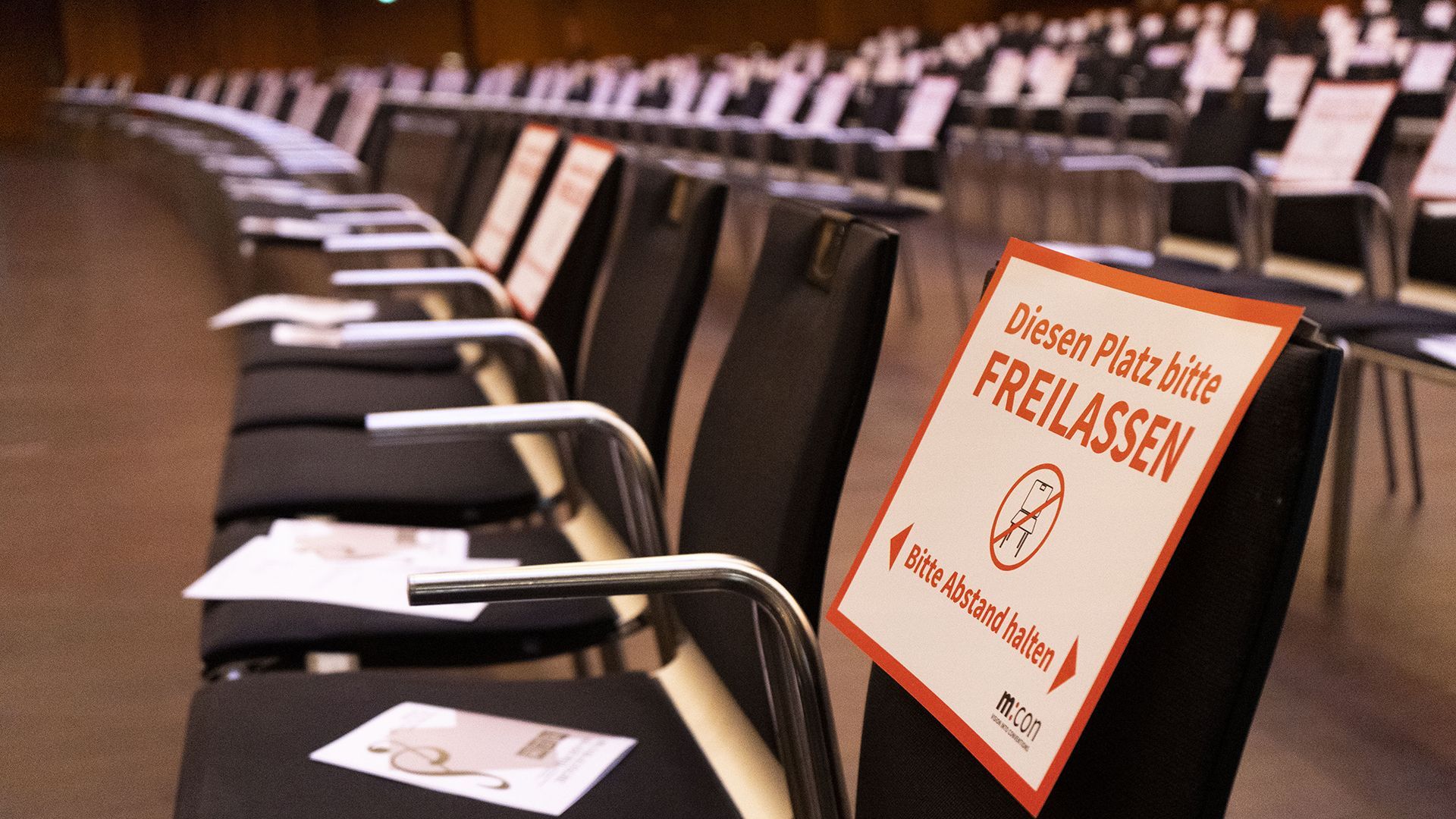 Bitte freilassen: Um den Mindestabstand zu wahren, sind einige Stühle im Mozartsaal des Mannheimer Congress Center Rosengarten nur mit Platzhaltern besetzt. Foto: m:con, Christian Luettich