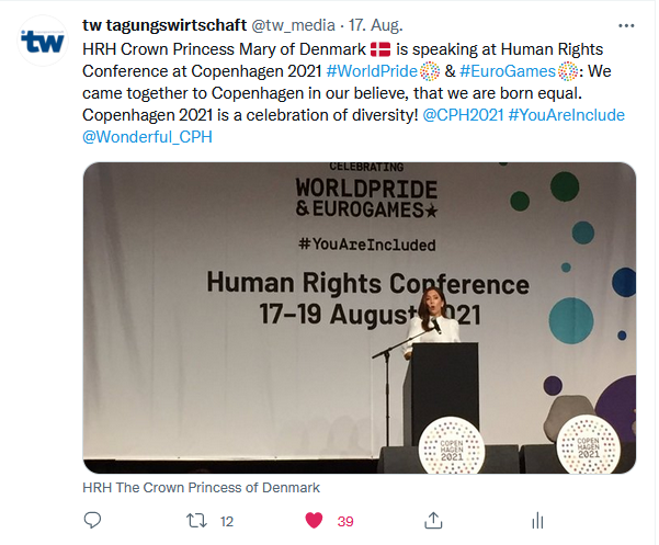 „Wir sind aus aller Welt zusammengekommen, weil wir glauben, dass wir alle gleich geboren sind. Es gibt Platz für jeden von uns. Copenhagen 2021 ist ein Fest der Vielfalt“, sagt Ihre Königliche Hoheit die Kronprinzessin von Dänemark Mary zur Eröffnung der Human Rights Conference am 17. August 2021. Die Konferenz ist ein Teil von Copenhagen 2021, der wichtigsten LGBTI+-Veranstaltung (Lesbian, Gay, Bisexual, Transsexuell/Transgender und Intersexual) des Jahres, die vom 12. bis 22. August dreifach Premiere hat: Sie umfasst die Events WorldPride und EuroGames, findet in Kopenhagen und Malmö statt und steht unter königlicher Schirmherrschaft. Patronin Mary weiß, dass Minderheiten in Krisenzeiten oft unverhältnismäßig stark betroffen sind, und die LGBT-Gemeinschaft das in der Pandemie stark zu spüren bekommt. Sie appelliert an die Zuhörer in den Øksenehallen in Kopenhagen wie an den Computern zu Hause: „Krisen sind Zeiten, in denen wir uns zusammentun, um einen neuen Weg zu finden und uns auf jene zu konzentrieren, die am verletzbarsten sind.“
