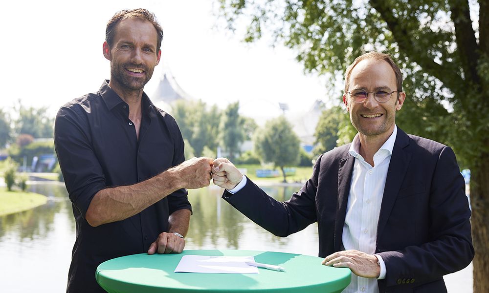 Psychische Gesundheit: Hannawald neuer Botschafter der AOK Bayern. Die AOK Bayern verstärkt ihr Engagement im Bereich psychische Gesundheit. Gemeinsam mit Sven Hannawald will die Krankenkasse auf das sensible Thema aufmerksam machen und gezielt auf Präventionsangebote hinweisen. Im Bild: Sven Hannawald und Stephan Abele, stellvertretender Vorstandsvorsitzender der AOK Bayern, bei der Vertragsunterzeichnung im Münchner Olympiapark.