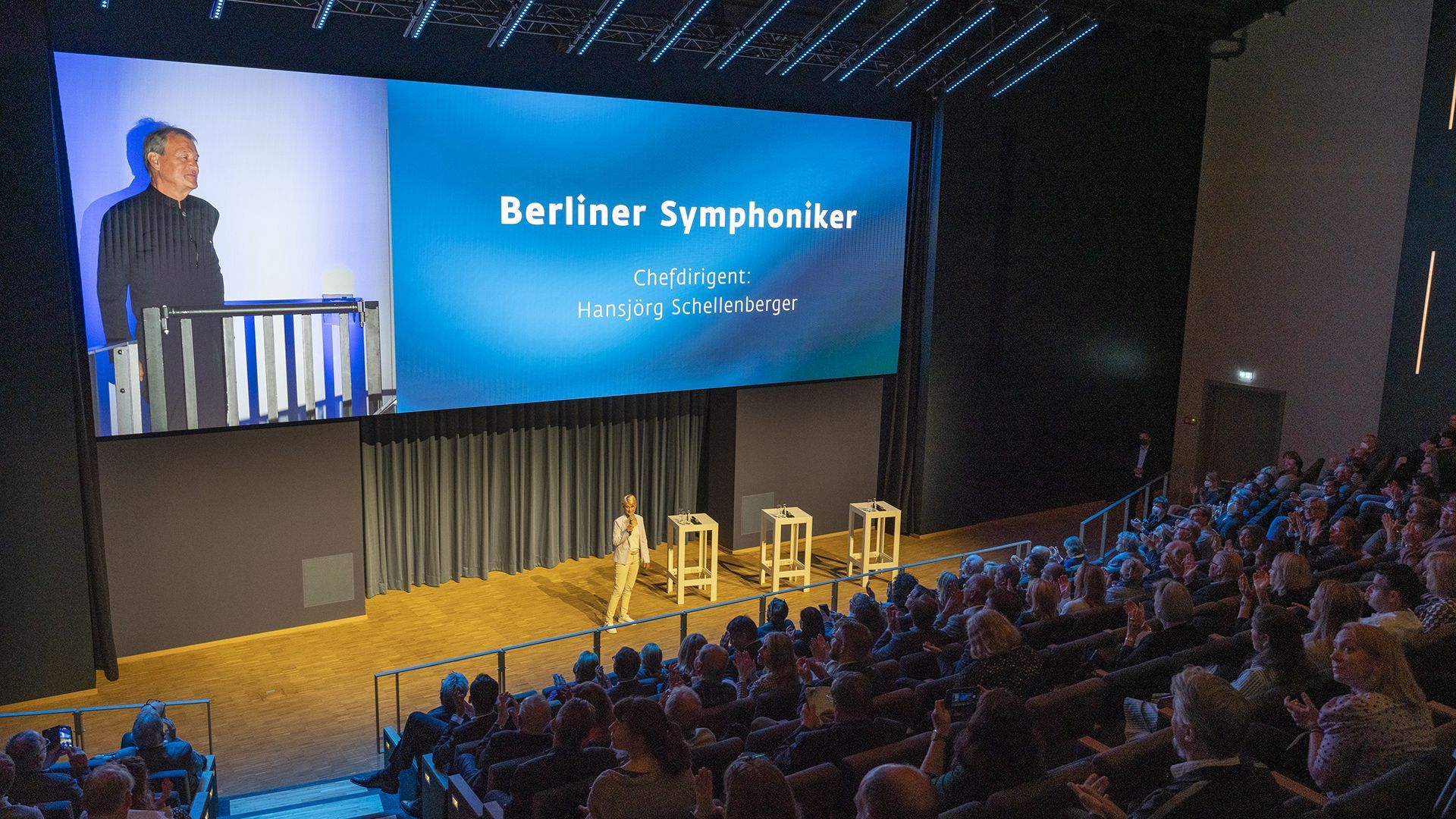 Im neuen Auditorium im Estrel Congress Center sind die Räume miteinander vernetzt. Bei der musikalischen Einlage der Berliner Symphoniker dirigiert Hansjörg Schellenberger aus dem neuen Auditorium heraus seine Musiker, die sich in Kleingruppen auf die Tagungsräume verteilen. Foto: Estrel Berlin
