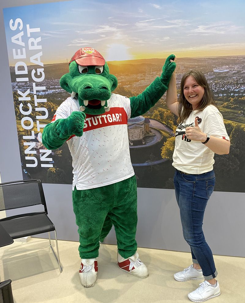 Karina Grützner posiert mit Fritzle, dem Maskottchen des VfB Stuttgart 1893. Foto: Stuttgart-Marketing