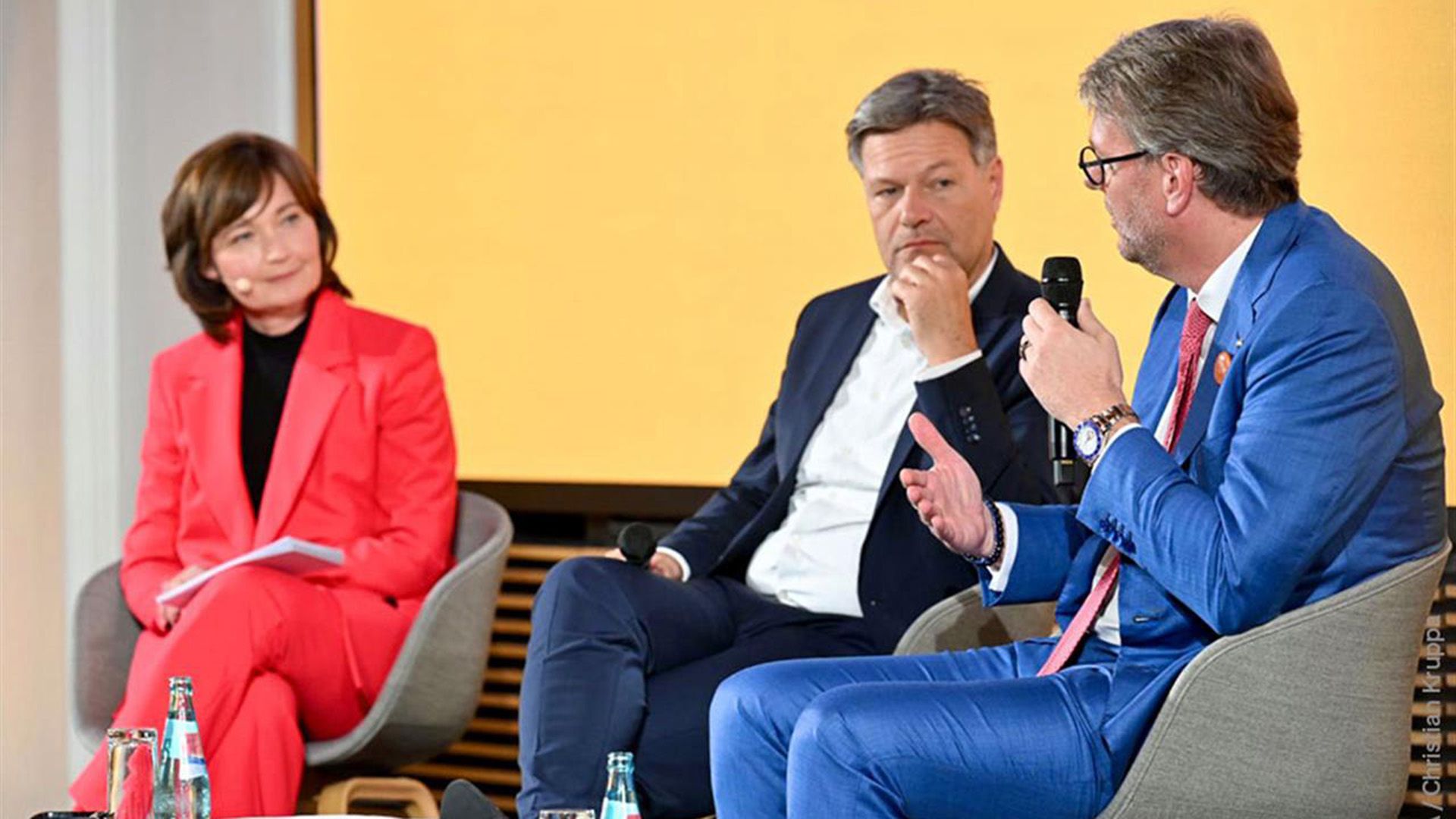 Freuen sich über den Erfolg des ältesten Förderprogramms des Wirtschaftsministeriums: Moderatorin Monika Jones, Bundeswirtschaftsminister Robert Habeck und Auma-Vorsitzender Philip Harting. Foto: Christian Kruppa