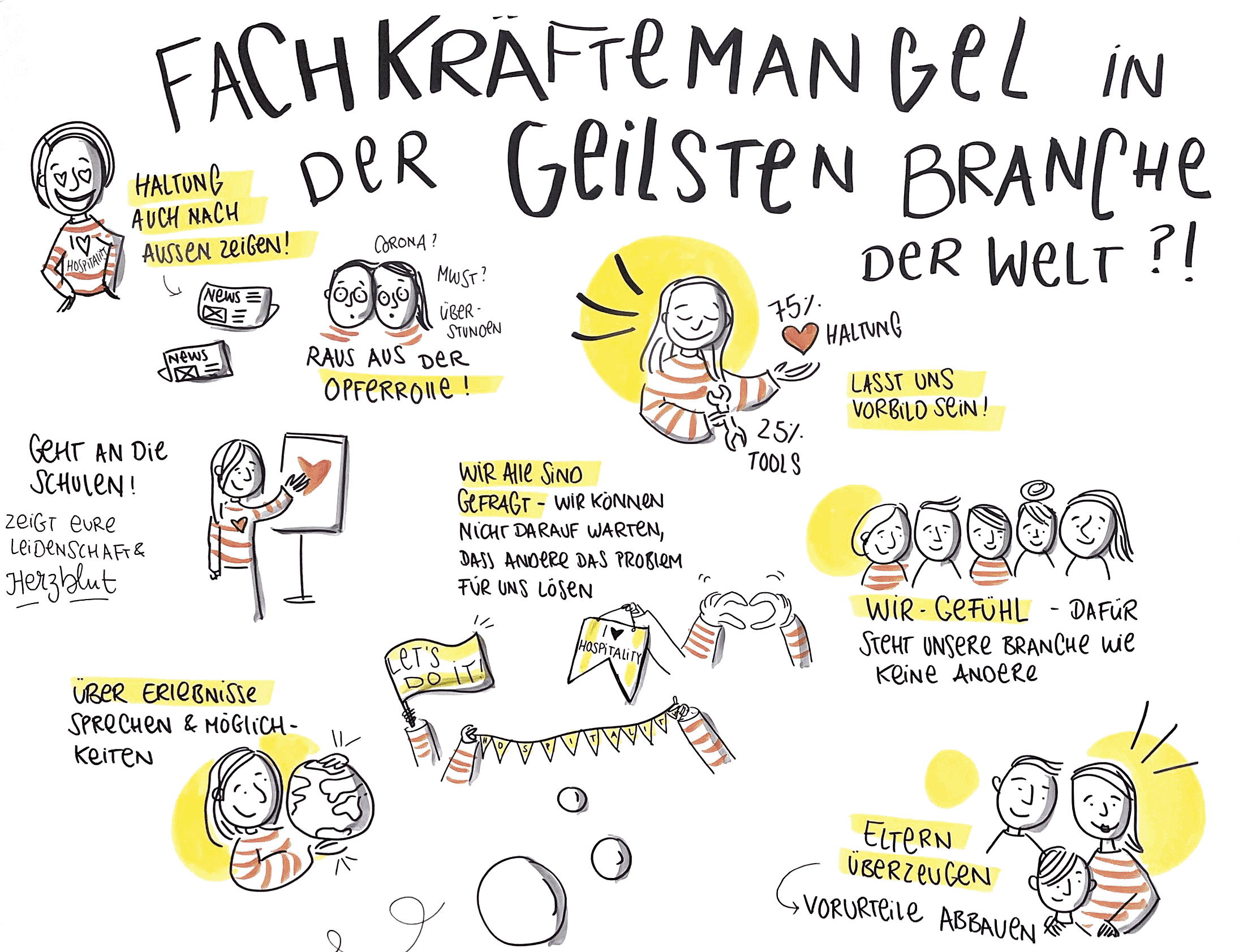 Graphic Recording der Session „Fachkräftemangel in der geilsten Branche der Welt“ beim HotelCamp 2023. Im letzten Jahr fanden 61,5 Prozent aller Seminare, Tagungen und Kongresse in Tagungshotels statt, für die personelle Engpässe einen besonders hohen Stellenwert im Tagesgeschäft haben. Foto: Hospitality Sales & Marketing Association Deutschland e.V. (HSMA)