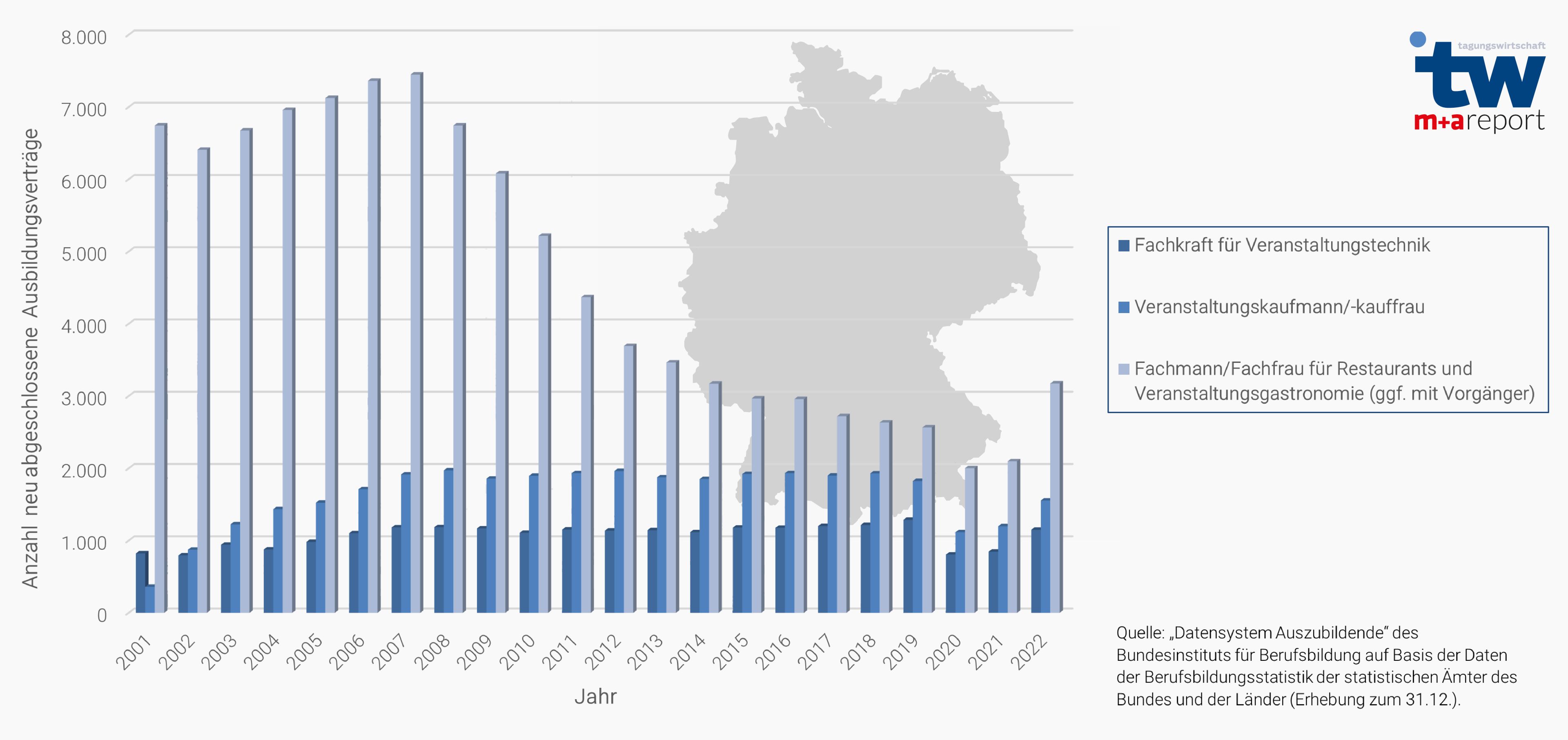 Die Neuabschlüsse von Ausbildungsverträgen für die Ausbildungsberufe Fachkraft für Veranstaltungstechnik und Veranstaltungskaufleute im Vergleich zum Fachmann/Fachfrau für Restaurants und Veranstaltungsgastronomie (bundesweit): Vor dem Corona-Einbruch blieben die Zahlen seit 2010 relativ konstant. Über alle Jahrgänge und Lehrberufe in der Veranstaltungswirtschaft hinweg geht der R.I.F.E.L. e.V. von 28.000 Auszubildenden aus. Grafik: tw tagungswirtschaft