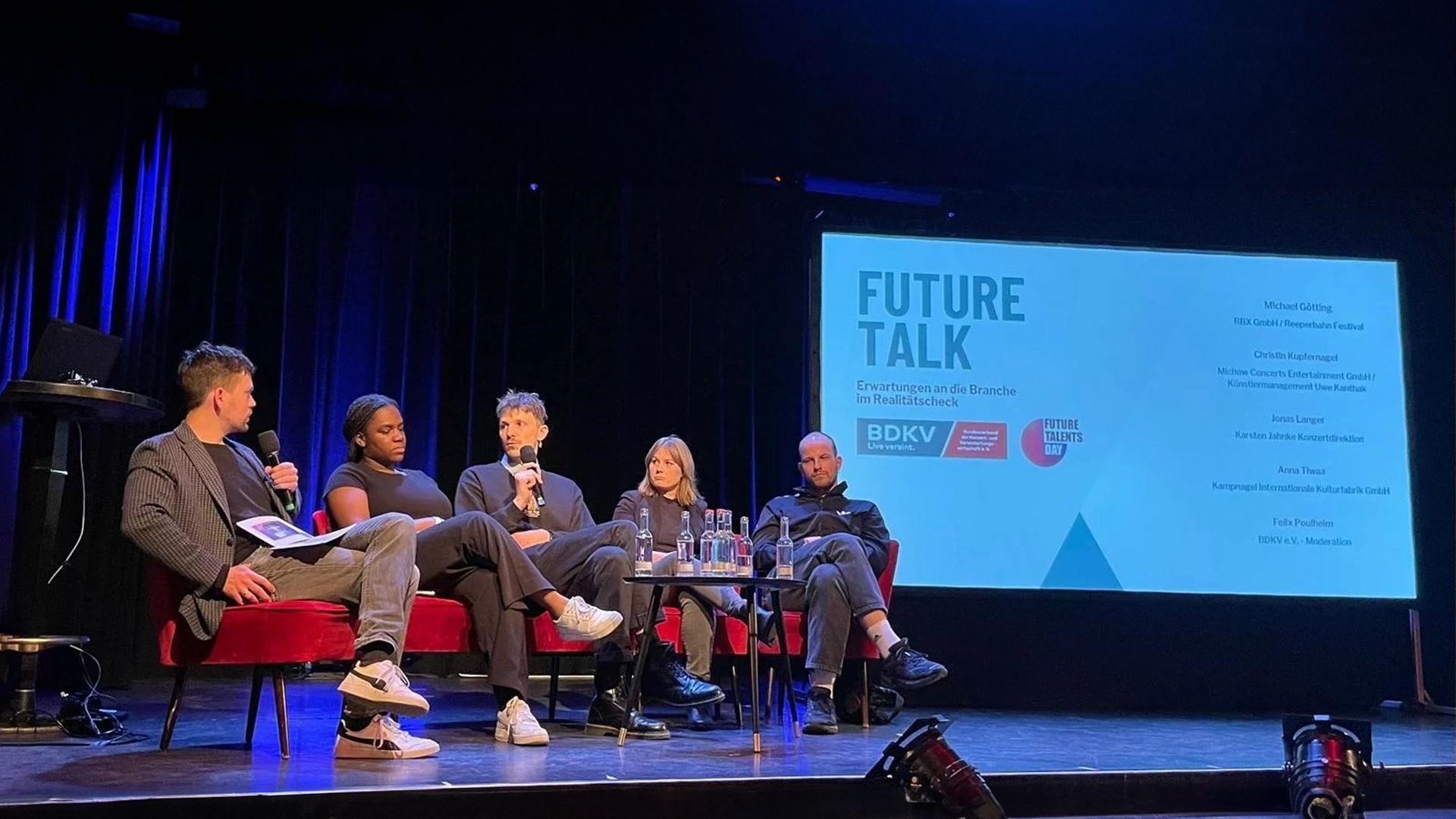 Die Verbände im Forum Veranstaltungswirtschaft (EVVC, VPLT und BDKV) veranstalten regelmäßig den Future Talents Day. Die nächste Ausgabe findet am 20. September 2024 auf dem Reeperbahn Festival für Schüler:innen der 9. und 10. Klassen statt. Beim „Future Talk: Erwartungen an die Branche im Realitätscheck” ging es auf der Meet Hamburg 2024 um die Bedürfnisse junger Arbeitnehmer:innen. Foto: BDKV – Bundesverband der Konzert- und Veranstaltungswirtschaft
