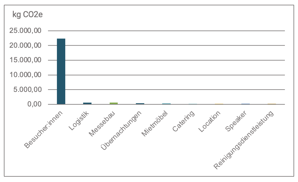 Die Zusammensetzung der CO2e-Emissionen zeigen die beiden nachfolgenden Grafiken. Wir haben dazu bewusst zwei Darstellungen gewählt. Diese separate Darstellung zeigt auch bei diesem Veranstaltungsformat, dass die An- und Abreise der Besucher:innen mit 22.127 kg CO2e-Emissionen bei gesamt 24.000 kg CO2e--Emissionen einen sehr hohen Anteil am Gesamtwert ausmachen. Hier ist neben dem Aussteller auch die IMEX als Veranstalter gefragt, durch ein nachhaltiges Mobilitätskonzept mit z.B. einer Mobilitätsplattform die Emissionen zu reduzieren.