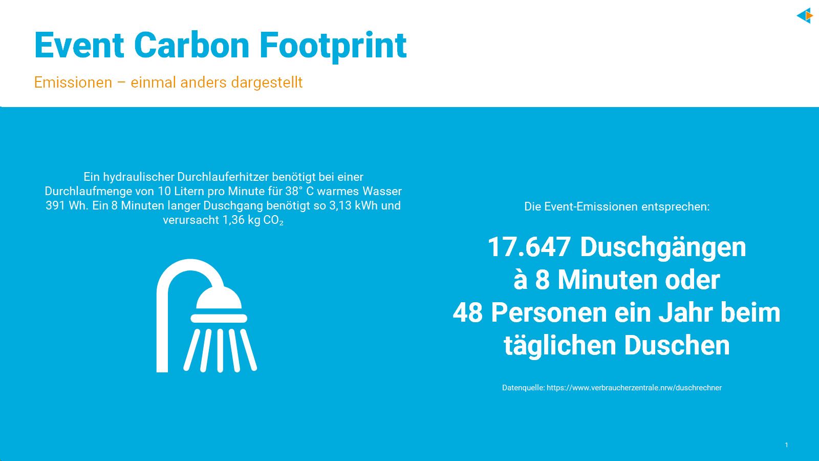 Die CO2e-Emissionen des Messeauftritts der tw tagungswirtschaft auf der IMEX 2024 betrugen insgesamt 24 Tonnen und wurden aus 50 Datenpunkten ermittelt. Da man sich unter 24 Tonnen CO2e-Emissionen nur schwer etwas vorstellen kann, haben wir den Wert einmal anders – aus dem täglichen Leben heraus – dargestellt: nämlich wie viele Menschen dafür ein Jahr lang täglich duschen könnten.